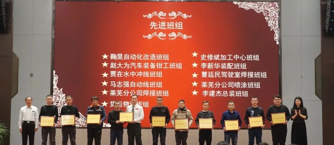 先進班組:鞠昊自動化改造班組、史修斌加工中心班組、趙大為汽車裝備鉗工班組、李新華裝配班組、賈在水中沖線班組、曹廷民駕駛室焊接班組、馬志強自動線班組、萊蕪分公司噴涂班組、萊蕪分公司焊接班組、李建杰總裝班組,貨運物流班組