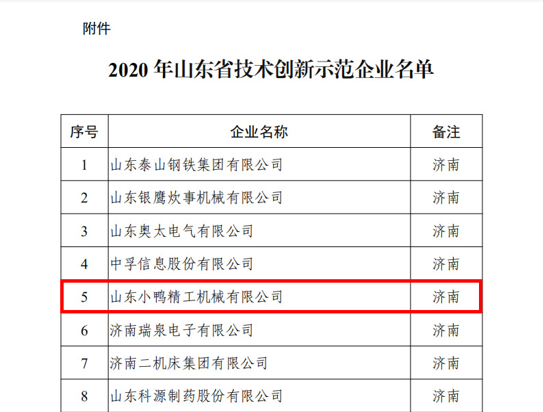 瀏覽量:0近日,山東省工業(yè)和信息化廳發(fā)布2020年山東省技術(shù)創(chuàng)新示范企業(yè)名單,山東小鴨精工機(jī)械有限公司成功入選。小鴨精工在技術(shù)創(chuàng)新領(lǐng)域精耕細(xì)作,持續(xù)的研發(fā)投入和體系優(yōu)化,用技術(shù)創(chuàng)新驅(qū)動(dòng)產(chǎn)業(yè)發(fā)展,公司技術(shù)研發(fā)實(shí)力不斷提升,為省級(jí)技術(shù)創(chuàng)新示范企業(yè)的申請(qǐng)成功奠定了基礎(chǔ)。