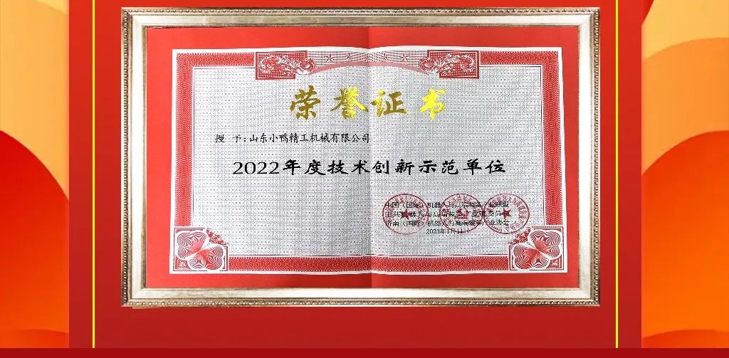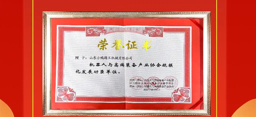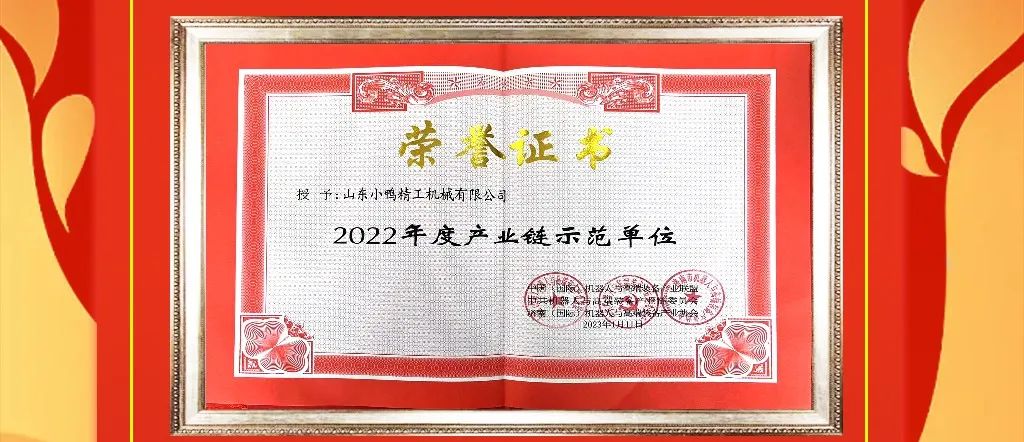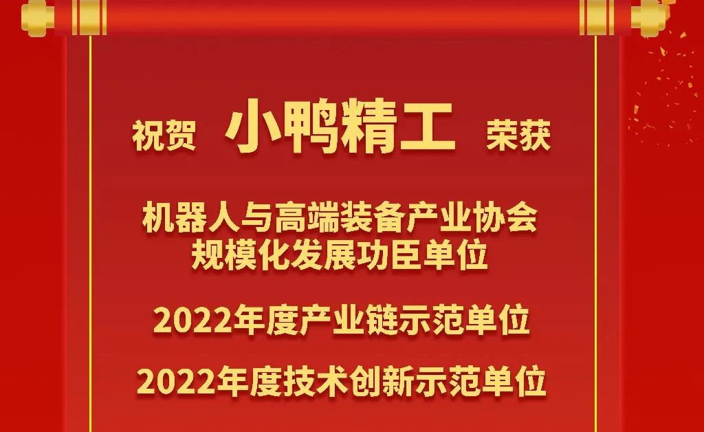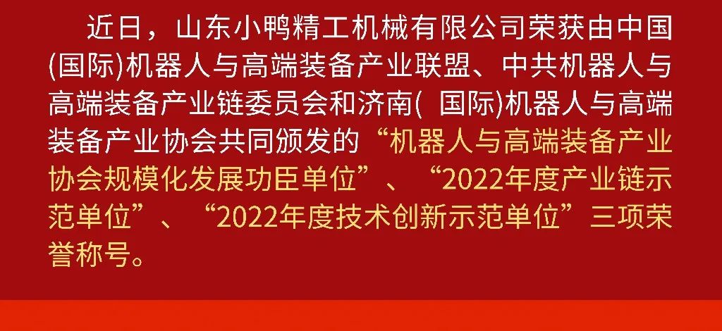 近日,山東小鴨精工機械有限公司榮獲由中國(國際)機器人與高端裝備產(chǎn)業(yè)聯(lián)盟、中共機器人與高端裝備產(chǎn)業(yè)鏈委員會和濟南( 國際)機器人與高端裝備產(chǎn)業(yè)協(xié)會共同頒發(fā)的“機器人與高端裝備產(chǎn)業(yè)協(xié)會規(guī)?;l(fā)展功臣位”“2022年度產(chǎn)業(yè)鏈示范單位”“2022年度技術(shù)創(chuàng)新示范單位”三項榮譽稱號。