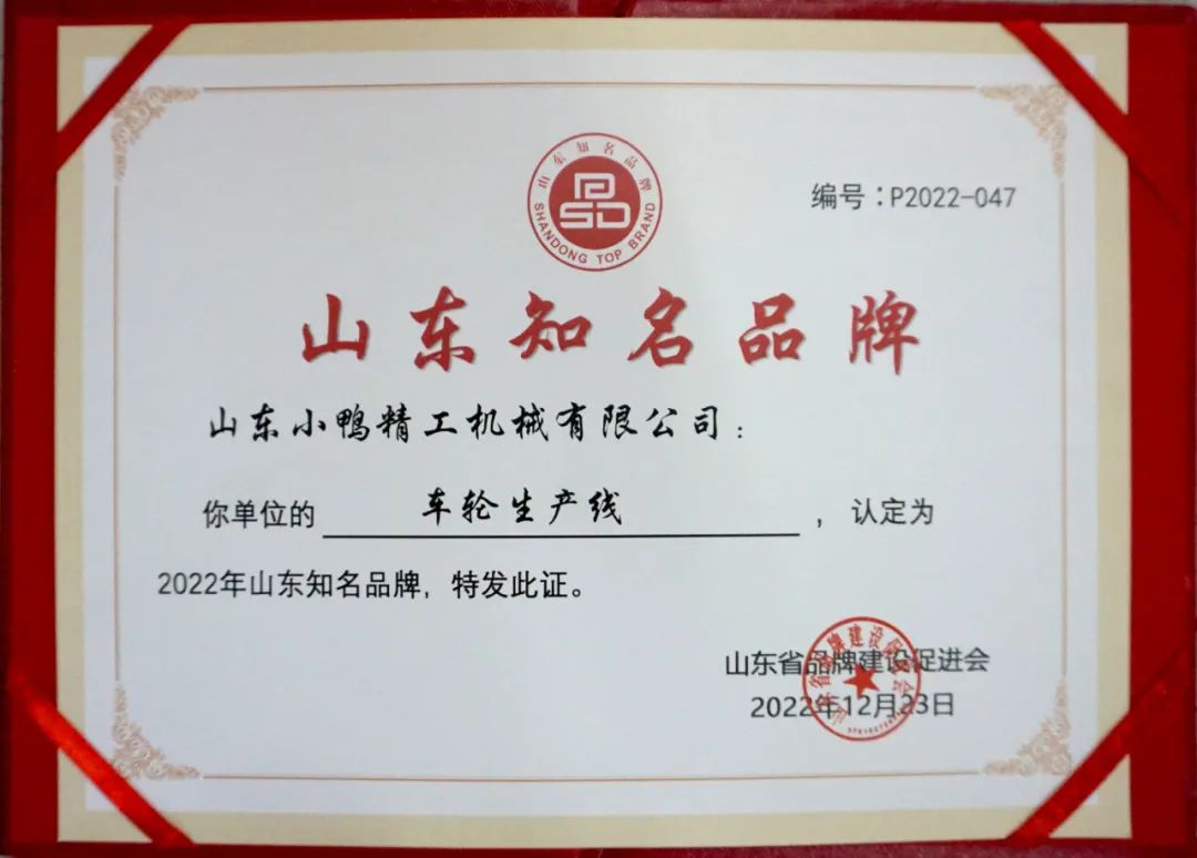 近日,根據(jù)《山東知名品牌認(rèn)定管理辦法》的規(guī)定,經(jīng)組織申報(bào)資格審查、大數(shù)據(jù)信息挖掘、信息化系統(tǒng)平臺(tái)評審、專家評審認(rèn)定專家委員會(huì)審議、認(rèn)定委員會(huì)認(rèn)定等工作程序,山東小鴨精工機(jī)械有限公司的車輪生產(chǎn)線項(xiàng)目被認(rèn)定為2022年山東知名品牌。