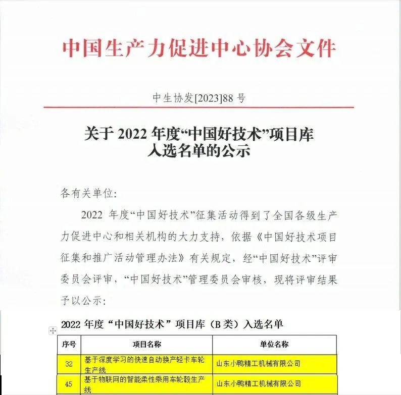 2022年度“中國(guó)好技術(shù)”評(píng)選活動(dòng)經(jīng)過(guò)專家組的嚴(yán)格評(píng)審,最終選出342項(xiàng)先進(jìn)實(shí)用、貼近民生的“中國(guó)好技術(shù)”成果,其中小鴨精工的兩個(gè)項(xiàng)目:“基于物聯(lián)網(wǎng)的職能柔性乘用車車輪轂生產(chǎn)線”、“基于深度學(xué)習(xí)的快速自動(dòng)換產(chǎn)輕卡車輪生產(chǎn)線”入選獎(jiǎng)項(xiàng)。