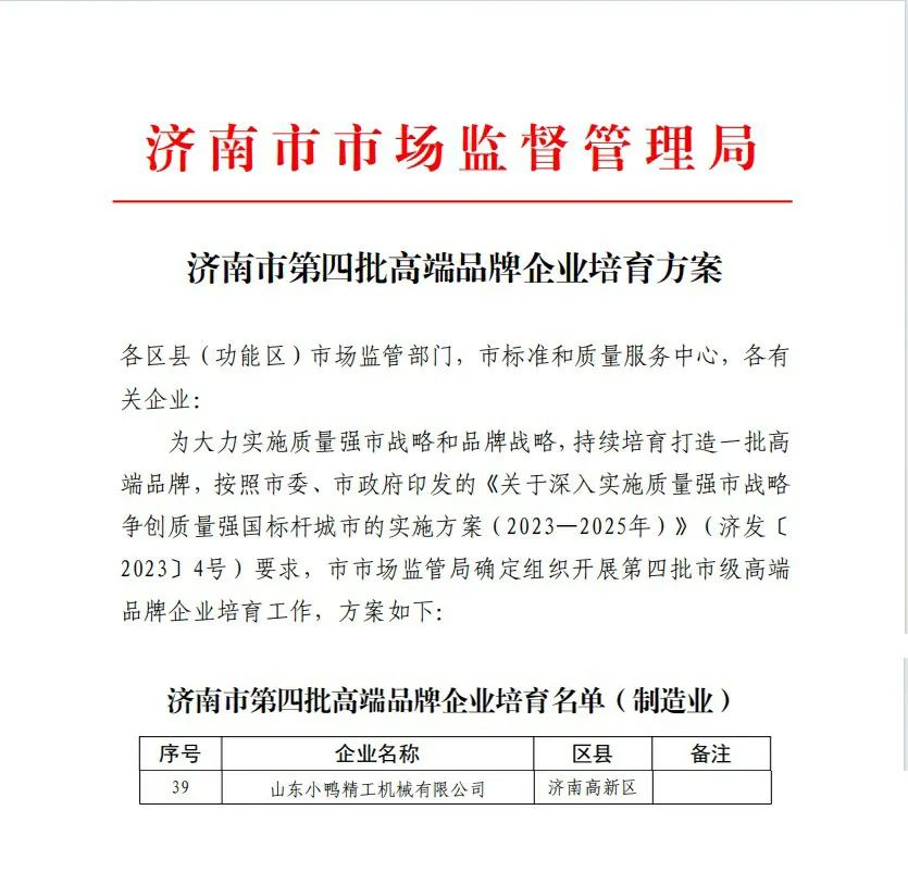 濟南市市場監(jiān)督管理局公布了濟南市第四批高端品牌企業(yè)培育名單。經(jīng)組織申報、資格審查、專家評審、綜合評價、結(jié)果審定等層層選拔,小鴨精工成功入選高端品牌企業(yè)培育名錄(制造業(yè))。